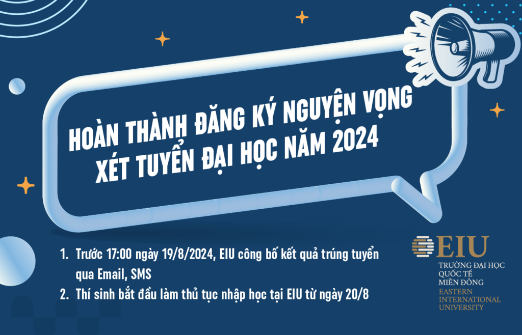Trường Đại học Quốc tế Miền Đông (EIU) chúc mừng tất cả các thí sinh đã đăng ký thành công nguyện vọng xét tuyển đại học năm 2024 vào EIU trước 17h ngày 30/7/2024 theo quy trình xét tuyển chung của Bộ Giáo dục và Đào tạo. Các bạn thí sinh lưu ý, EIU tuân […]