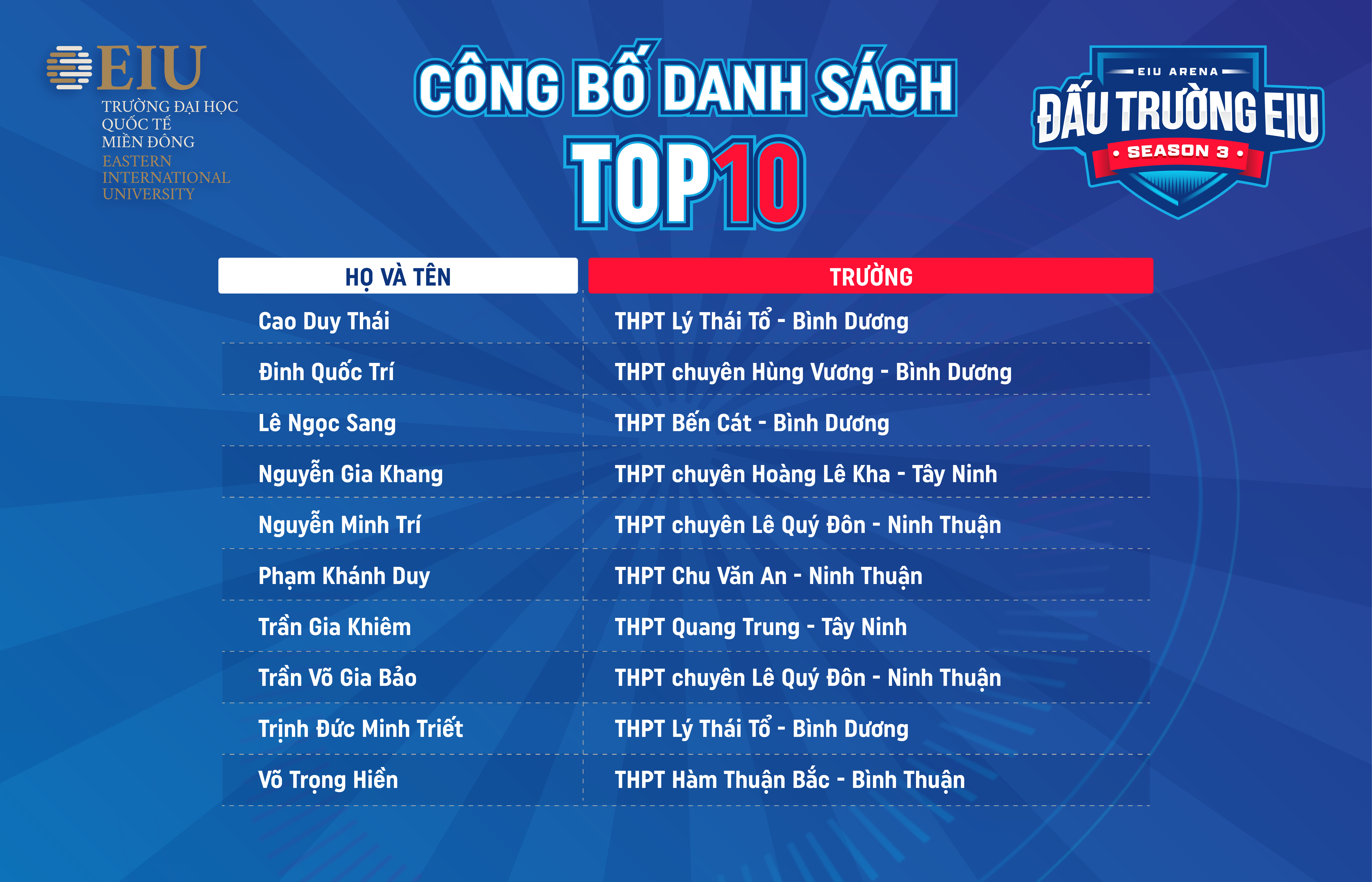 EIU Arena is an annual competition organized by EIU to provide a scientific playground where high school students nationwide can explore and strengthen their comprehensive learning capabilities by answering questions in various fields, including Natural Sciences, Social Sciences and Humanities, Technology, Engineering, Economics, and Law, among others. This year, EIU Arena Season 3 has attracted nearly 10,000 participants from high schools across the country. Once again, EIU congratulates the Top 10 contestants who have advanced to the Grand Finale of EIU Arena Season 3.