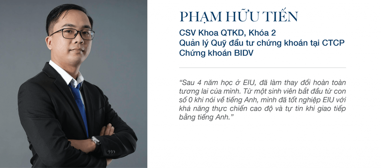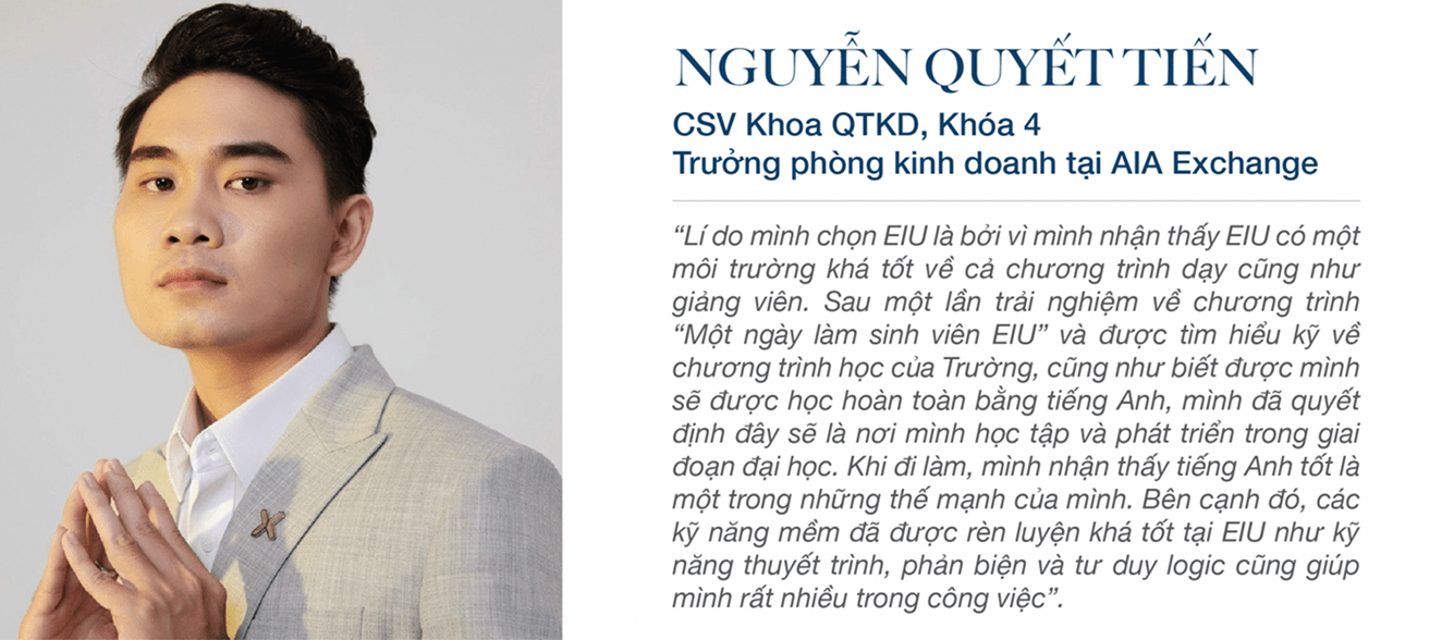 Tại EIU, sinh viên Khoa Quản trị kinh doanh được trang bị đầy đủ những kiến thức về kinh tế và kỹ năng quan trọng, giúp các bạn tự tin hoà nhập với môi trường làm việc thực tế ngay sau khi tốt nghiệp, đáp ứng tốt yêu cầu đặt ra từ cộng đồng doanh nghiệp, nâng cao khả năng cạnh tranh và có năng lực tự học hỏi trau dồi để phát triển bản thân.